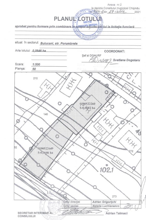Descrierea Lotul: 17-V Locaţie: mun. Chişinău Sectorul: Buiucani Adresa: str. Porumbrele nr. cadastral: 0100522.649 Destinație: Construcție locativă-individuală (zona R3) Prețul inițial: 500 000 lei Suprafața: 0,0646 ha