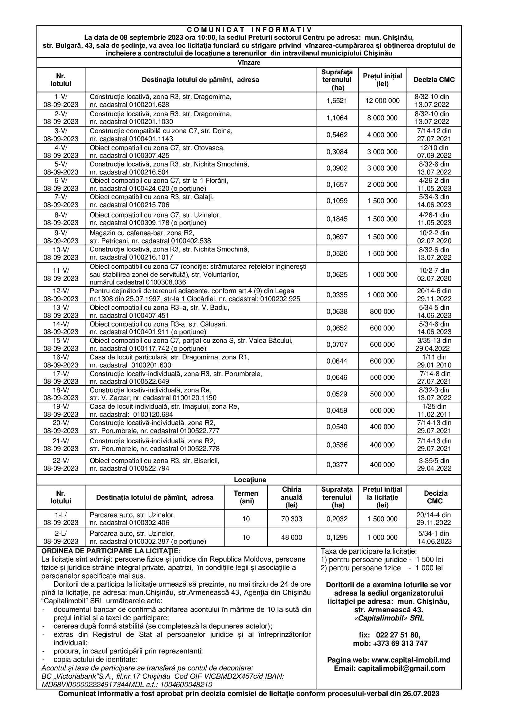 Doritorii de a examina loturile se vor adresa la sediul organizatorului licitației pe adresa: mun. Chişinău,
