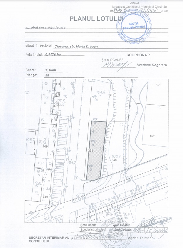 Descrierea Lotul: 7-V Locaţie: mun. Chişinău Sectorul: Ciocana Adresa: Maria Drăgan nr. cadastral: 0100305.298 Destinație: Obiectiv comercial, și de prestări servicii Prețul inițial: 1 600 000 lei Suprafața: 0,1176 ha