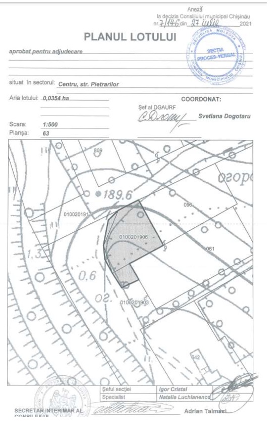 Descrierea Lotul: 8-V Locaţie: mun. Chişinău Sectorul: Centru Adresa: str. Petrarilor nr. cadastral: 0100201.906 Destinație: locativ - individulă, zona R2 Prețul inițial: 1 000 000 lei Suprafața: 0,0354 ha