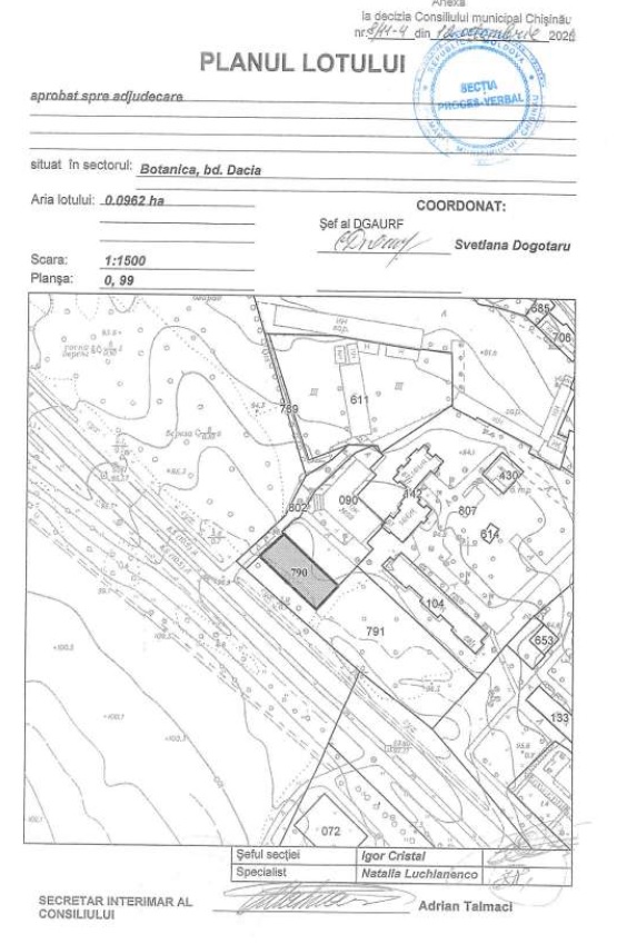 Descrierea Lotul: 13-V Locaţie: mun. Chişinău Sectorul: Botanica Adresa: bd. Dacia nr. cadastral: 0100120.790 Destinație: Obiectul comercial, prestarea serviciilor, zona C1 Prețul inițial: 2 500 000 lei Suprafața: 0,0962 ha