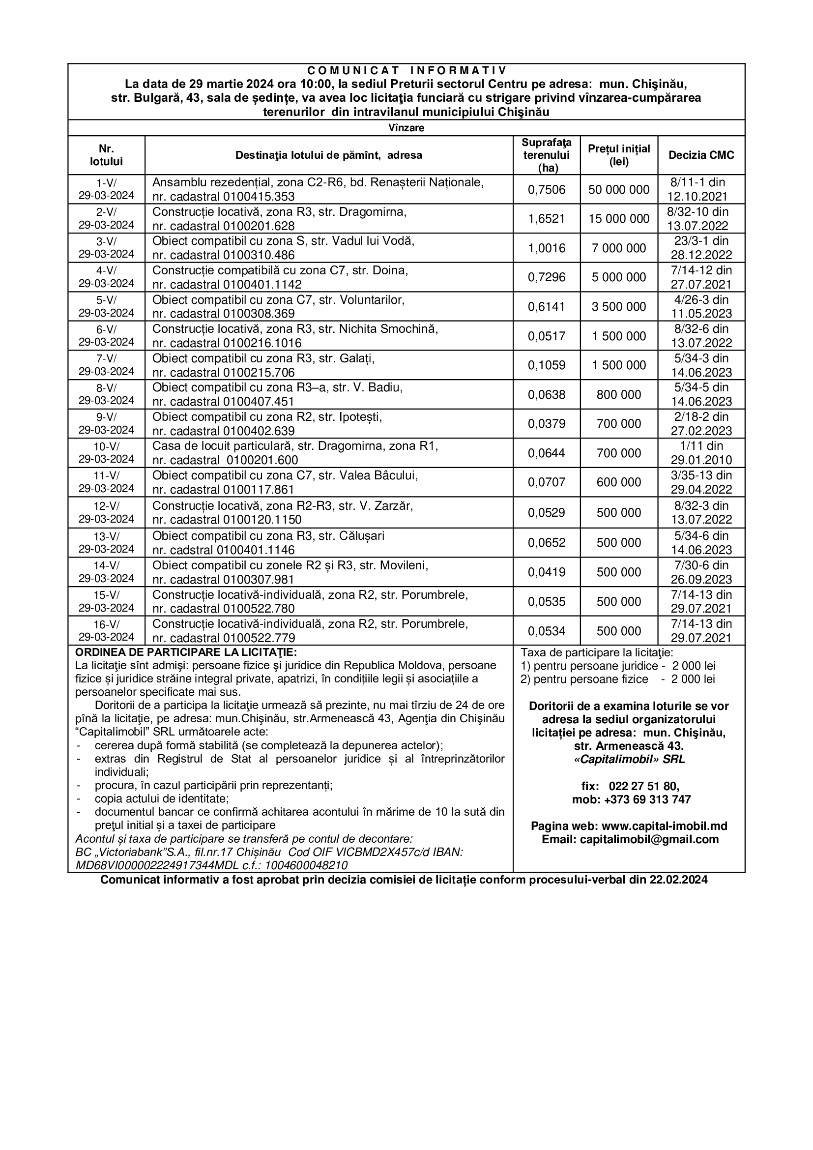Doritorii de a examina loturile se vor adresa la sediul organizatorului licitației pe adresa: mun. Chişinău,