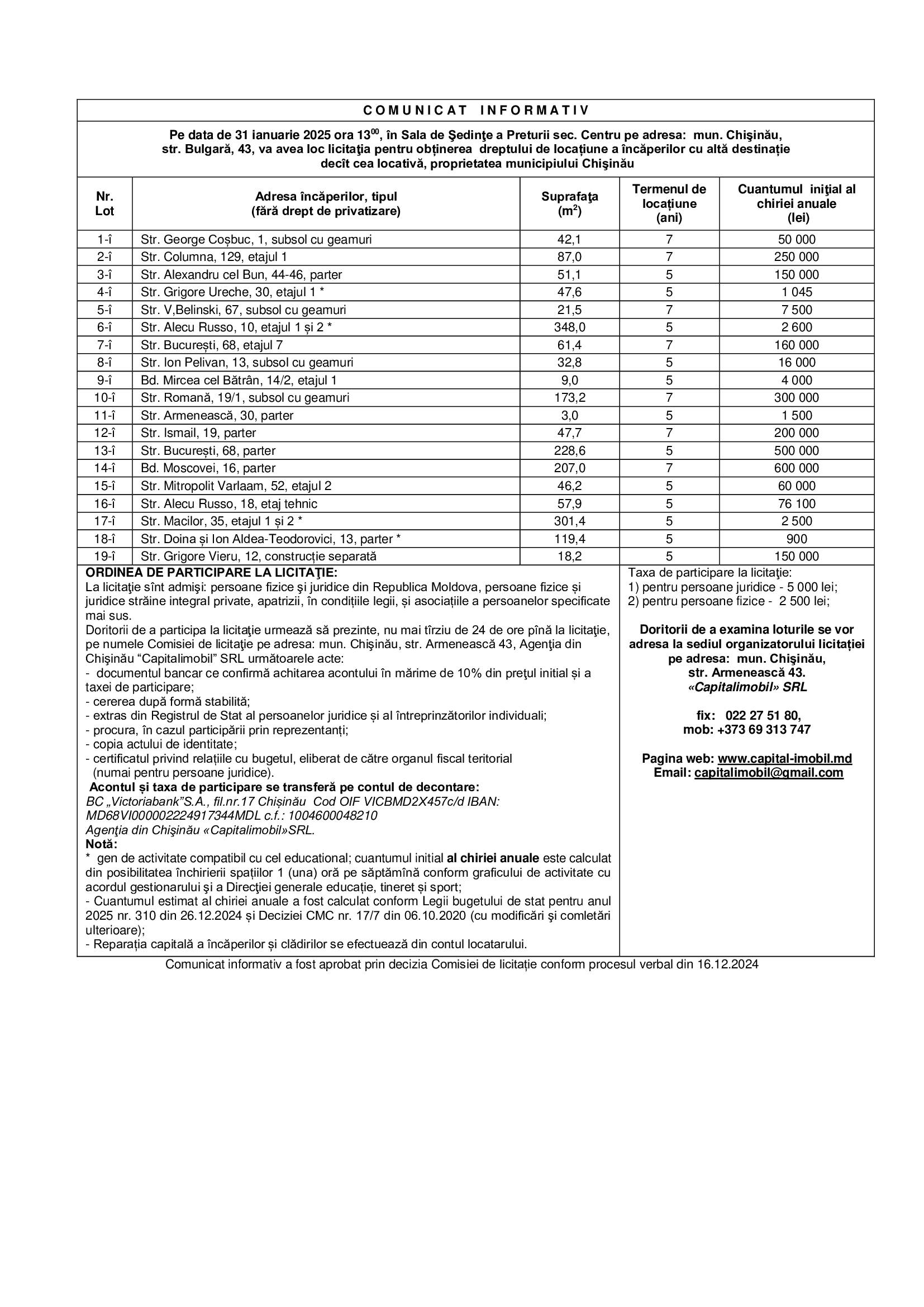 Doritorii de a participa la licitaţie urmează să prezinte, nu mai tîrziu de 24 de ore pînă la licitaţie, pe numele Comisiei de licitaţie pe adresa: mun. Chişinău, str. Armenească 43, Agenţia din Chişinău “Capitalimobil” SRL următoarele acte: