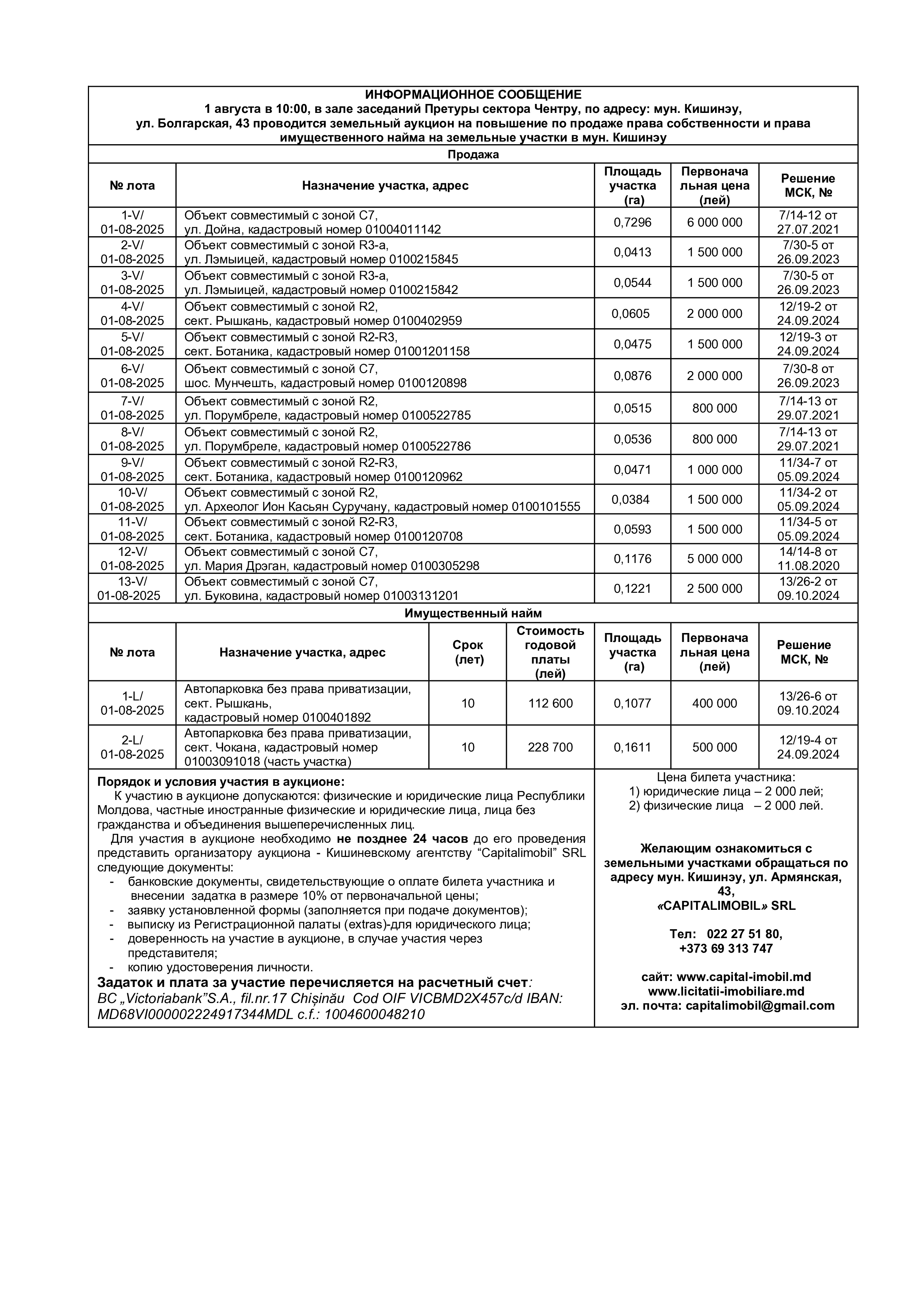 Для участия в аукционе необходимо не позднее 24 часов до его проведения представить организатору аукциона - Кишиневскому агентству “Capitalimobil” SRL следующие документы:
