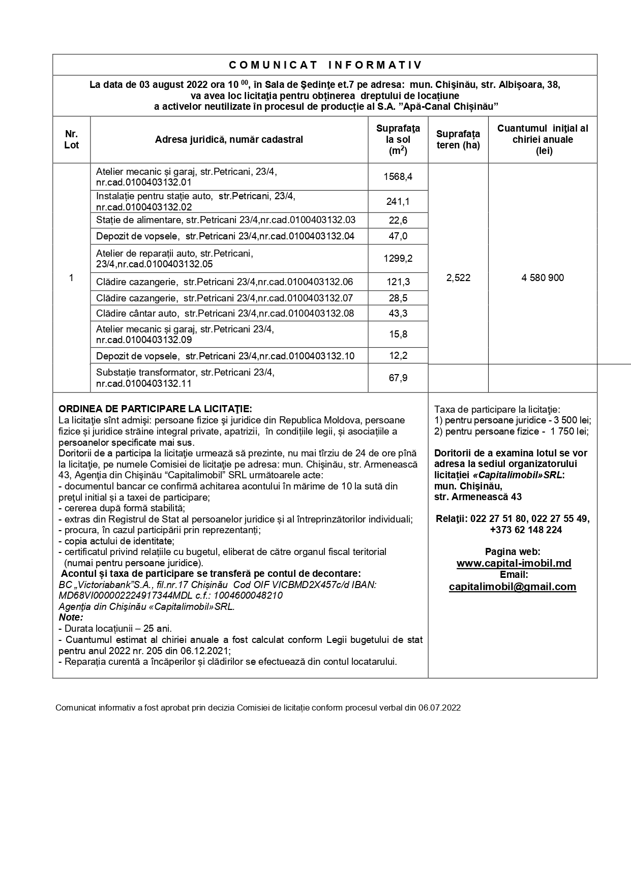 Doritorii de a examina lotul se vor adresa la sediul organizatorului licitației «Capitalimobil»SRL: mun. Chişinău,