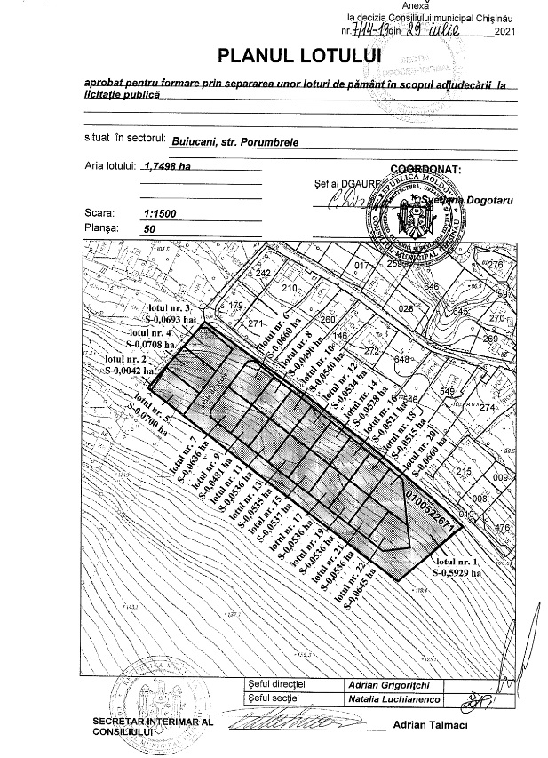 Описание Лот: 11-V Расположение: мун. Кишинёв Район: Буюкань Адрес: ул. Порумбреле кадастровый номер: 0100522.782 Назначение: Индивидуальное жилое строение, зона R2 Площадь: 0,0537 га Первоначальная цена: 500 000 лей