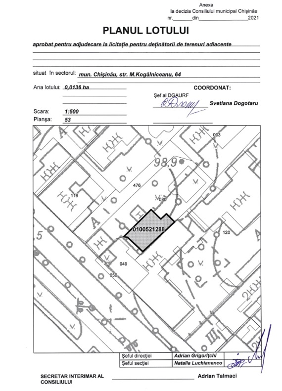 Описание Лот: 17-V Расположение: мун. Кишинёв Район: Буюканы Адрес: ул. Когэлничану кадастровый номер: 0100521.288 Назначение: Для собственников смежных объектов недвижимости, в соответствии с Законом №1308 от 25.07.1997 Площадь: 0,0136 га. Первоначальная цена: 903 700 лей
