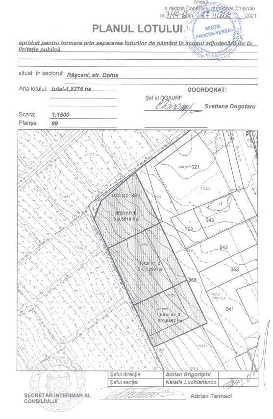 Описание Лот: 3-V Расположение: мун. Кишинёв Район: Рышкань Адрес: ул. Дойна кадастровый номер: 0100401.1143 Назначение: Объект совместимый с зоной С7 Площадь: 0,5462Га. Первоначальная цена: 4 000 000 лей