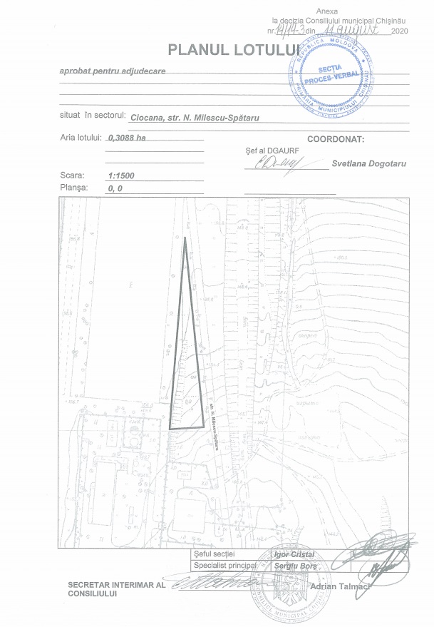 Описание Лот: 6-V Расположение: мун. Кишинёв Район: Чокана Адрес: ул. Н. Милеску Спэтарул кадастровый номер: 0100313.419 Назначение: Производственная база Площадь: 0,3088 Га. Первоначальная цена: 1 200 000 лей