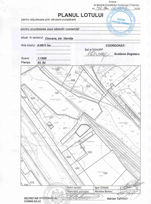 Описание Лот: 9-V Расположение: мун. Кишинёв Район: Чокана Адрес: ул. Варница кадастровый номер: 0100302.953 Назначение: Производственно-складская база Площадь: 0,0811 Га. Первоначальная цена: 800 000 лей