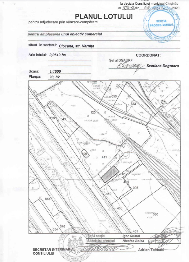Описание Лот: 10-V Расположение: мун. Кишинёв Район: Чокана Адрес: ул. Варница кадастровый номер: 0100302.952 Назначение: Производственно-складская база Площадь: 0,0619 Га. Первоначальная цена: 600 000 лей