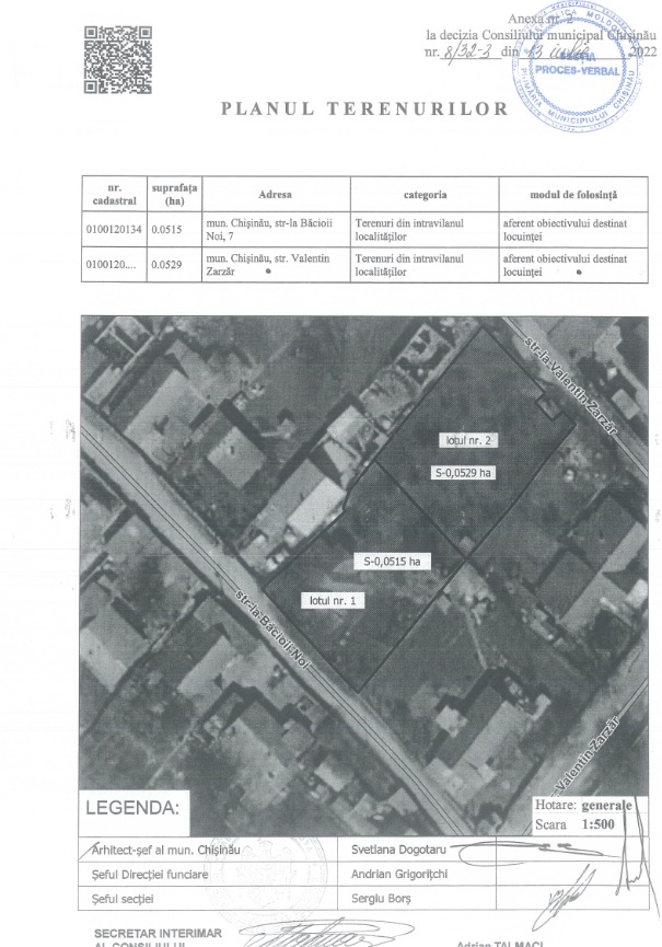 Описание Лот: 12-V Расположение: мун. Кишинёв Район: Ботаника Адрес: ул. В. Зарзар кадастровый номер: 0100120.1150 Назначение: Жилое строение, зона R2-R3 Площадь: 0,0529 га. Первоначальная цена: 500 000 лей